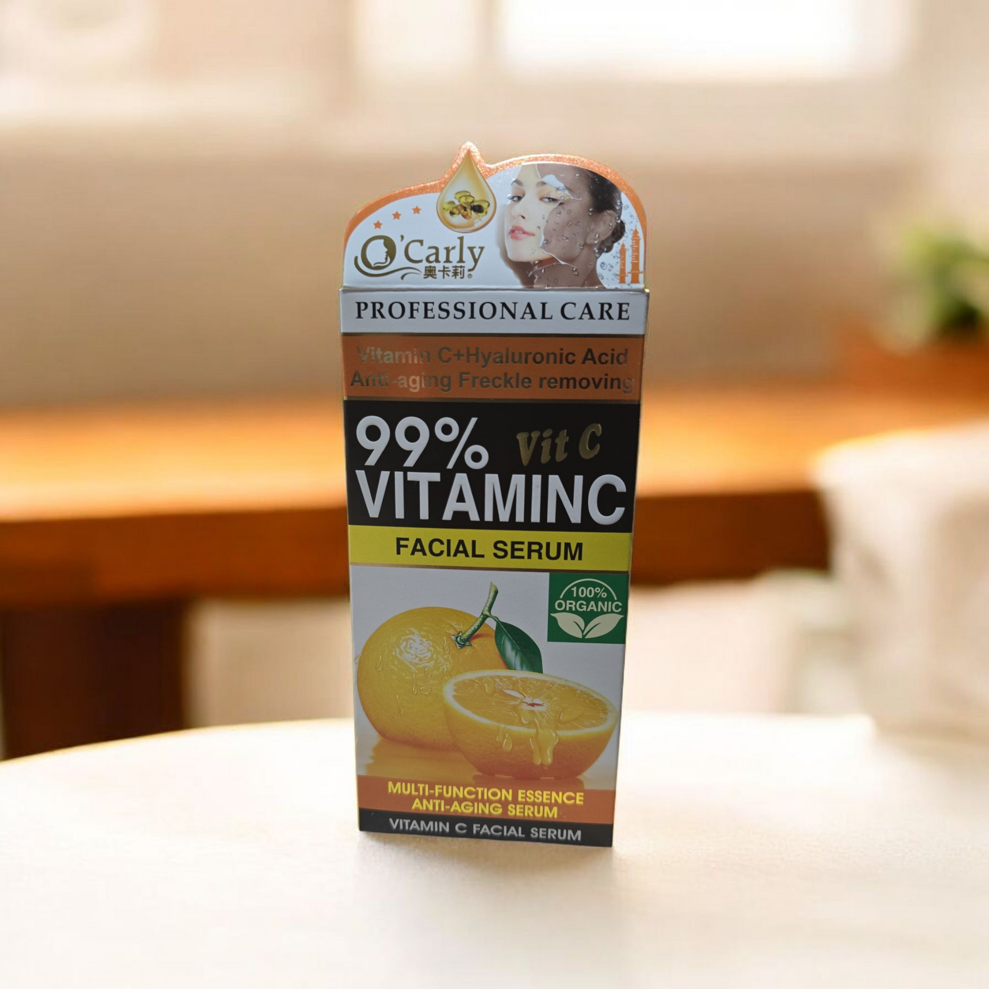 O'Carly 99% Vitamin C + Hyaluronic Acid Facial Serum is a skincare product designed to address various skin concerns, including anti-aging, freckles, spots, and wrinkles. It combines the benefits of vitamin C and hyaluronic acid to achieve its effects.